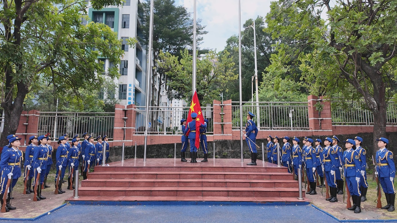 庄严升旗,共筑爱国情怀。迎着晨曦,学校国旗护卫队队员迈着铿锵有力的步伐入场。在雄壮的国歌声中,五星红旗冉冉升起,全体人员肃立行注目礼,共同表达对祖国的无限热爱与崇高敬意。